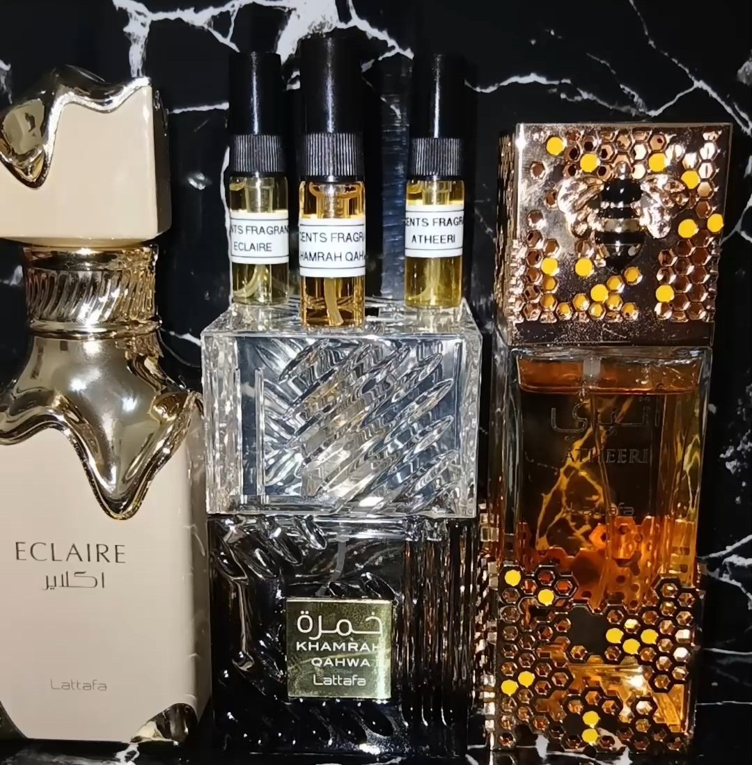 This Set Consists of Eclaire, Khamrah Qahwa and Atheeri by Lattafa Decants.
